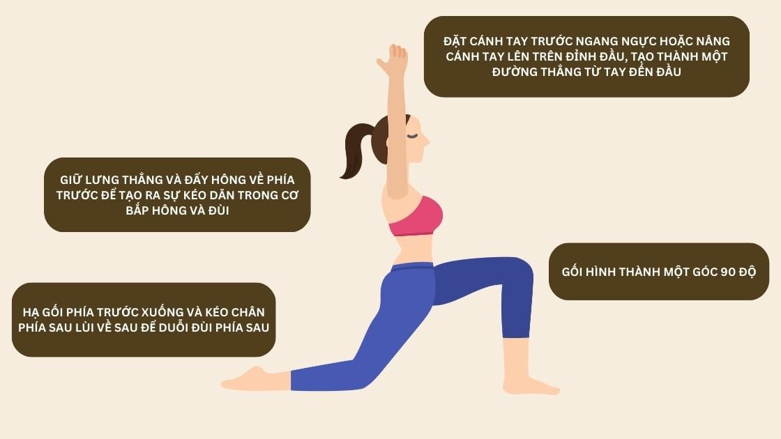 - Runner's Lunge (Tư thế Chạy Bộ): Đưa cánh tay trước lên và nghiêng cơ thể về phía trước, tạo ra tư thế giống như khi chạy bộ.